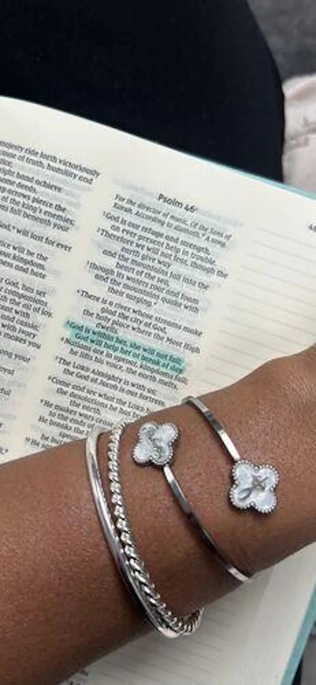 The Silver Bible Versed Clover Bangle is a meaningful piece with a sleek double-clover design. One clover is engraved with your chosen Bible verse, while the other features the Gospel Galore Signature Symbol, a reminder of the love and truth at the heart of the gospel. Elegant and versatile, this silver bangle makes a beautiful Christian gift and a subtle yet powerful way to express your faith daily. Whether you're dressing up for church, attending a summer event, or adding a spiritual touch to your everyday style, this bangle pairs perfectly with our classic Bible Versed Clover Bracelets for a stacked, faith-filled look.
