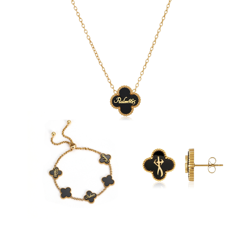 Bring your faith to life with the Christian Gold Clover Collection Bundle, featuring the Bible-versed Clover Necklace, Clover Bracelet, and Clover Earrings.