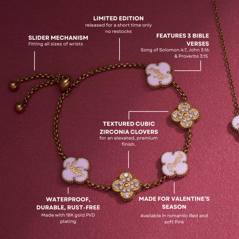 Our Valentine Bible-Versed Clover Bracelets are designed to carry God’s love with you, wherever you go. Each bracelet features all three Scriptures, Song of Solomon 4:7, John 3:16, and Proverbs 3:15, engraved into the clovers as a lasting declaration of faith.