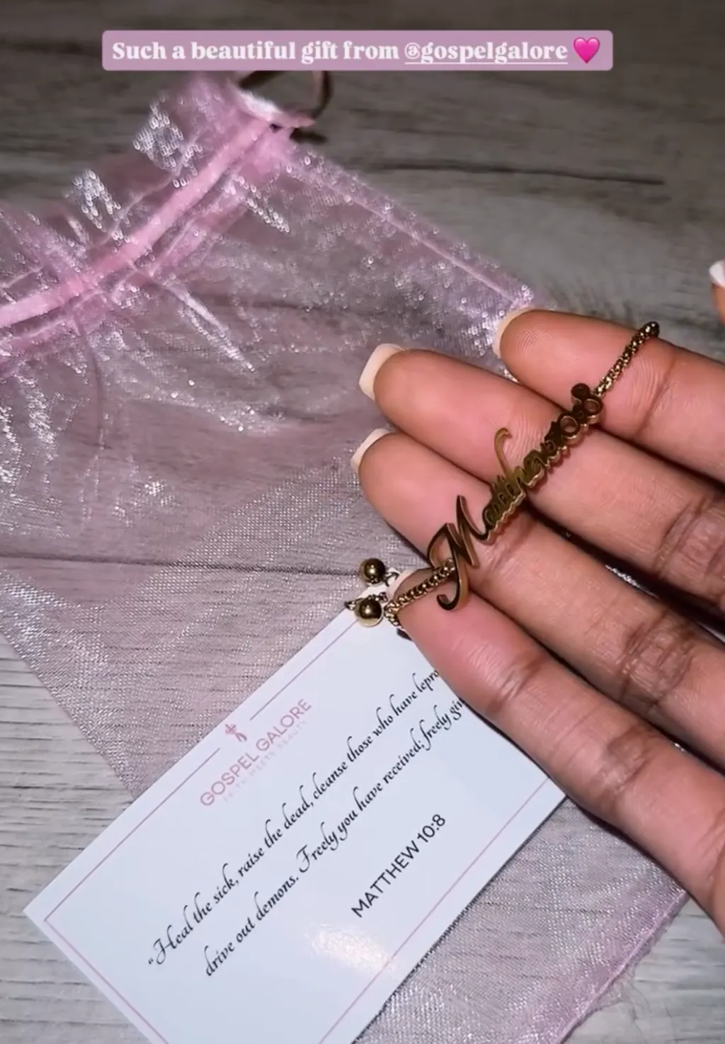 Express your faith in style with our Gold Personalised Bible Versed Name Bracelet. Personalise it with your favourite verse from over 31,000 Bible verses. Perfect for Christian gifts, baptisms, birthdays, or just because, this bracelet is more than jewellery, it’s a daily reminder of God’s Word beautifully worn. Ideal for stacking or pairing with other Gospel Galore pieces for a meaningful and stylish look.