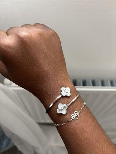 The Silver Bible Versed Clover Bangle is a meaningful piece with a sleek double-clover design. One clover is engraved with your chosen Bible verse, while the other features the Gospel Galore Signature Symbol, a reminder of the love and truth at the heart of the gospel. Elegant and versatile, this silver bangle makes a beautiful Christian gift and a subtle yet powerful way to express your faith daily. Whether you're dressing up for church, attending a summer event, or adding a spiritual touch to your everyday style, this bangle pairs perfectly with our classic Bible Versed Clover Bracelets for a stacked, faith-filled look.